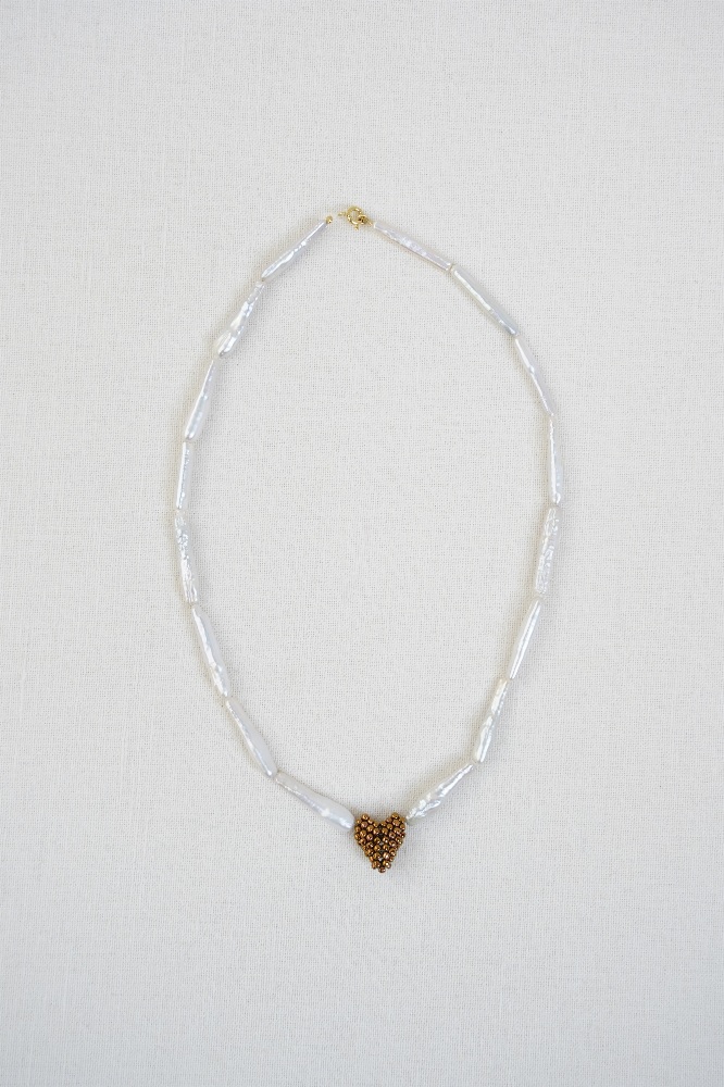 Women's freshwater pearl necklace, hand-decorated with a fruit made of glass beads. The clasp is made of gold-plated silver.