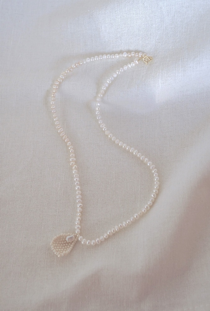 Woman's freshwater pearl necklace, adorned with a hand-woven shell made of glass beads. The clasp is made of gold-plated silver.