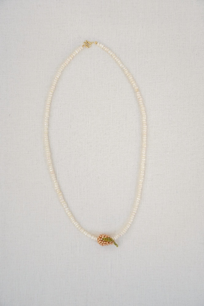 Women's necklace with small freshwater pearls, hand-decorated with a fruit made of glass beads. The clasp is made of gold-plated silver.
