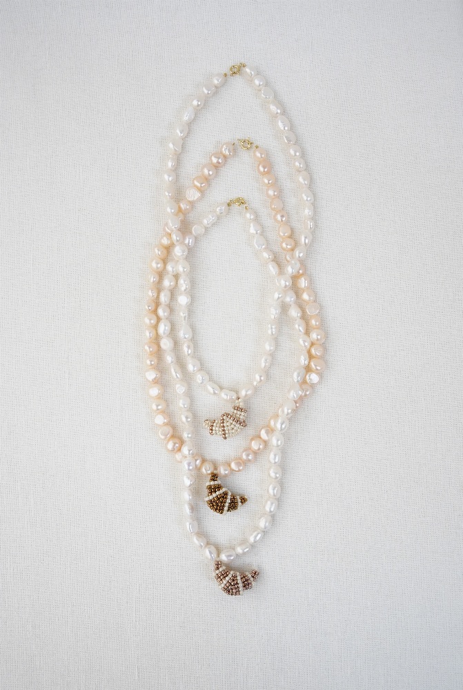Women's freshwater pearl necklace, adorned with a hand-woven horn made of glass beads. The clasp is made of gold-plated silver.