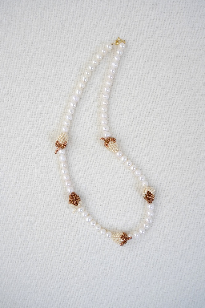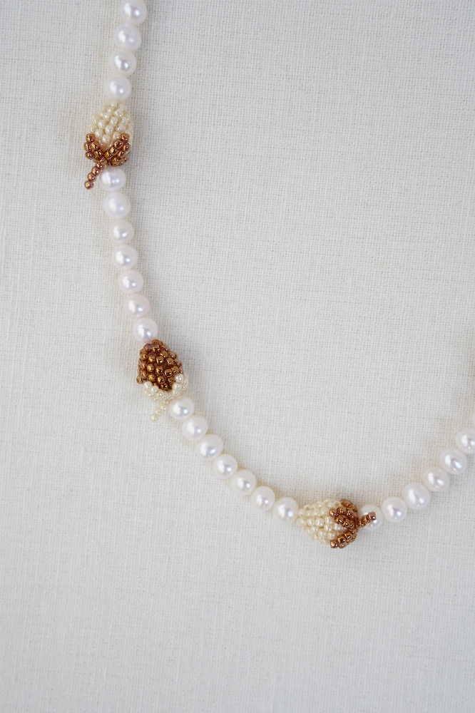 Women's necklace made of freshwater pearls, adorned with handwoven fruit made of glass beads. The clasp is made of gold-plated silver.