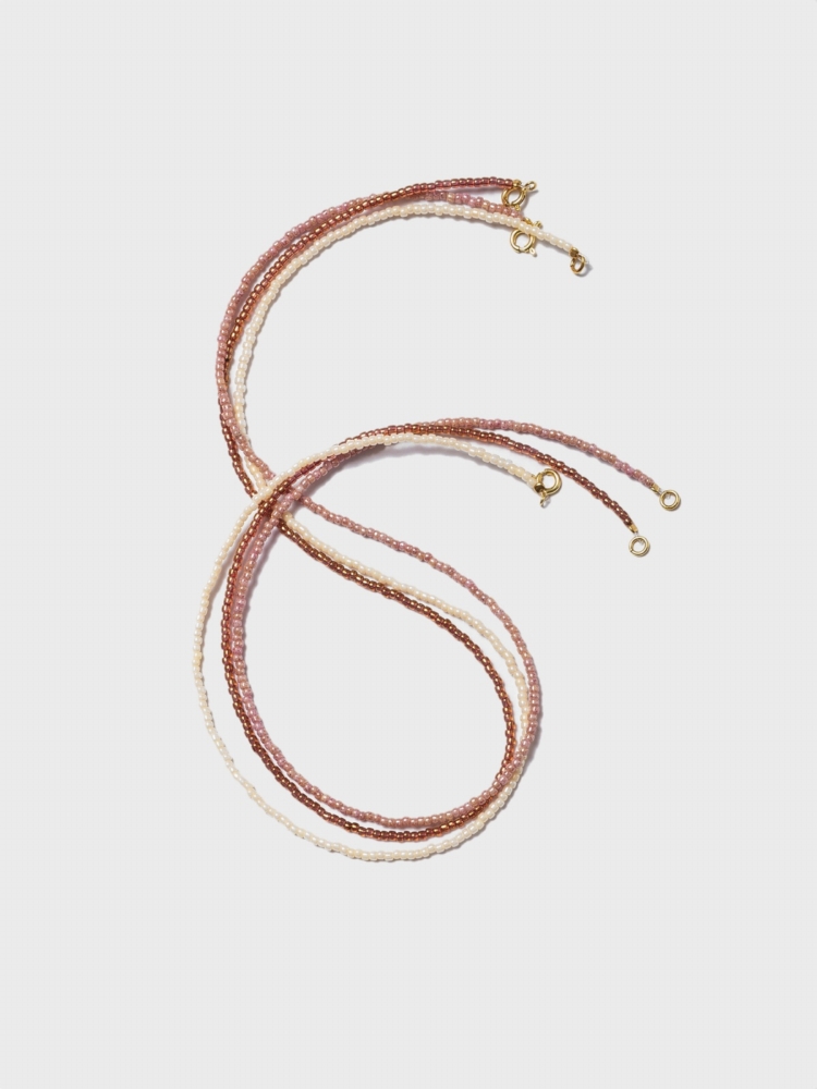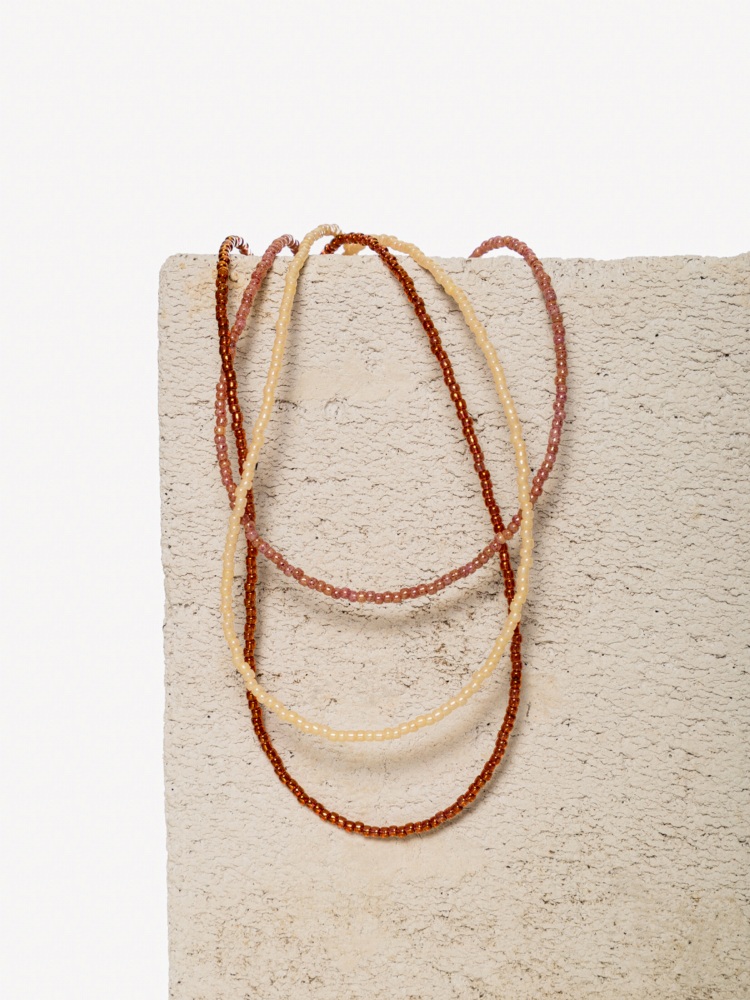Set of three women’s necklaces made entirely of glass beads in three different shades. The clasps are made of gold-plated silver. The jewelry is handmade in our small local workshop.