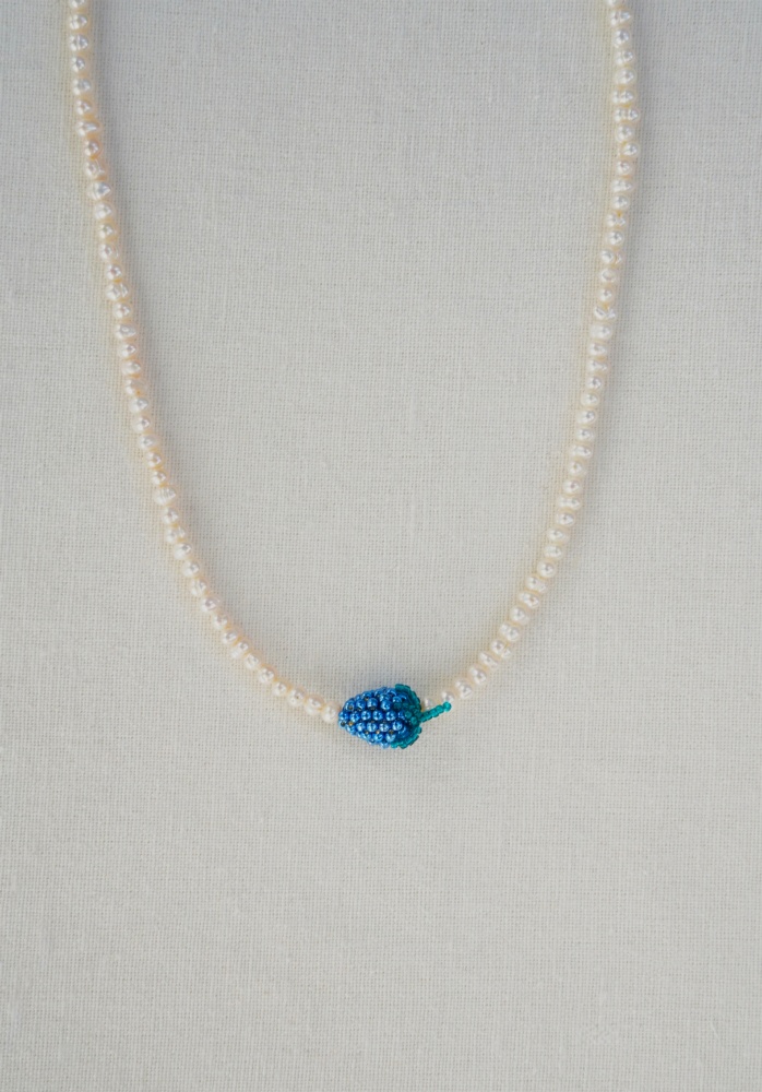 Women's necklace with freshwater pearls, hand-decorated with a hand-woven fruit made of glass beads. The clasp is made of gold-plated silver.