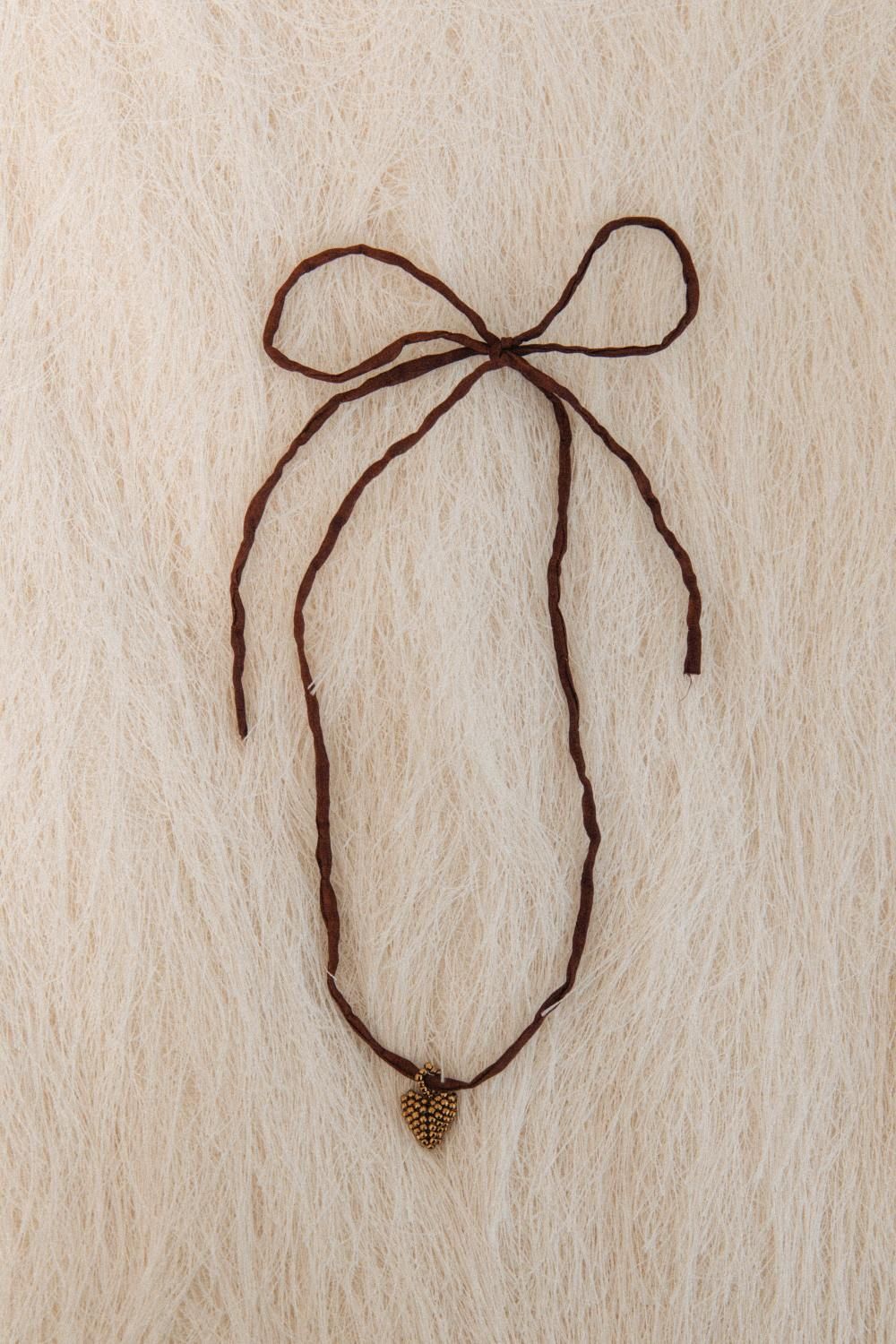 Women's necklace with a heart motif suspended on a silk ribbon. The ribbon has no clasp and can be tied in a bow.