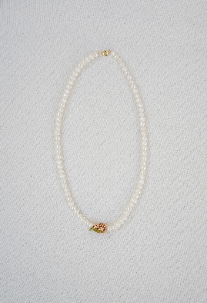 Naszyjnik damski z pereł słodkowodnych, ozdobiony ręcznie plecionym owocem ze szklanych koralików. Zapięcie wykonane jest ze srebra pozłacanego.
