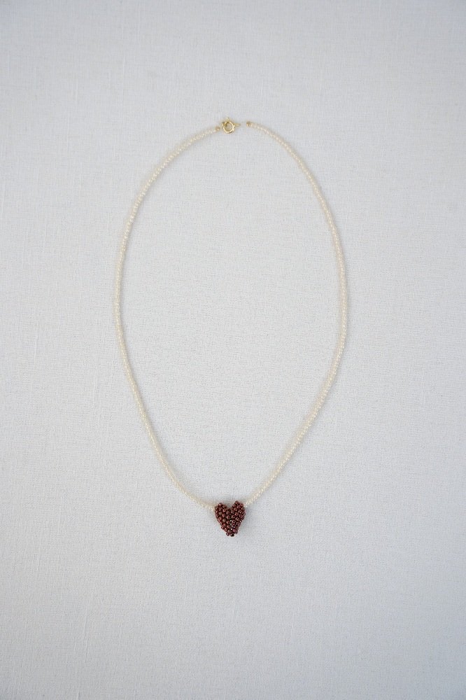 Naszyjnik damski wykonany w całości ze szklanych koralików z motywem serca. Zapięcie wykonane jest ze srebra pozłacanego.