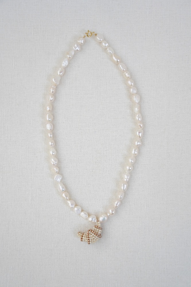 Naszyjnik damski z pereł słodkowodnych, ozdobiony ręcznie plecionym rogalem ze szklanych koralików. Zapięcie wykonane jest ze srebra pozłacanego.