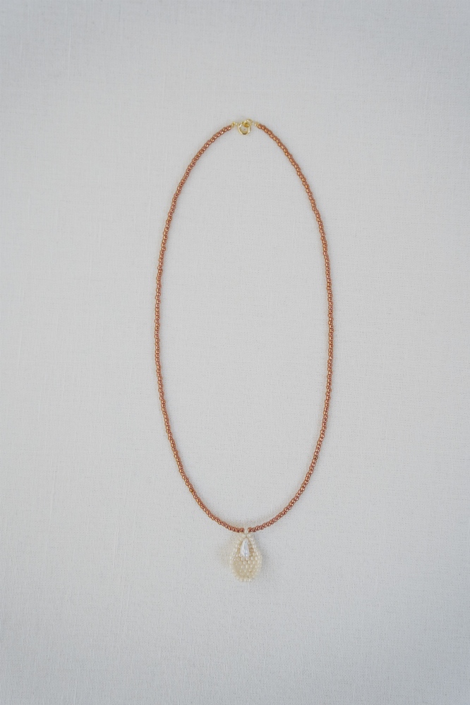 Naszyjnik damski wykonany w całości ze szklanych koralików z motywem muszli. Zapięcie wykonane jest ze srebra pozłacanego.