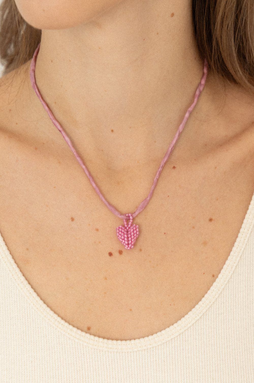 Naszyjnik damski z motywem serca zawieszonym na jedwabnej tasiemce. Tasiemka nie posiada zapięcia, można ją wiązać na kokardkę.