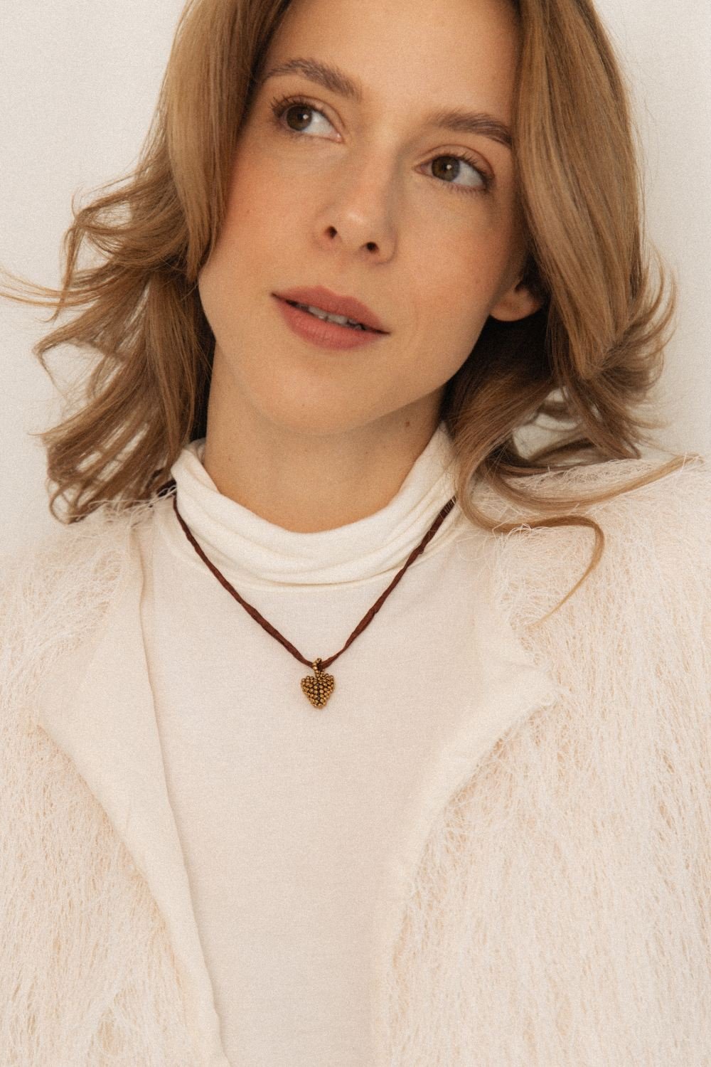 Naszyjnik damski z motywem serca zawieszonym na jedwabnej tasiemce. Tasiemka nie posiada zapięcia, można ją wiązać na kokardkę.