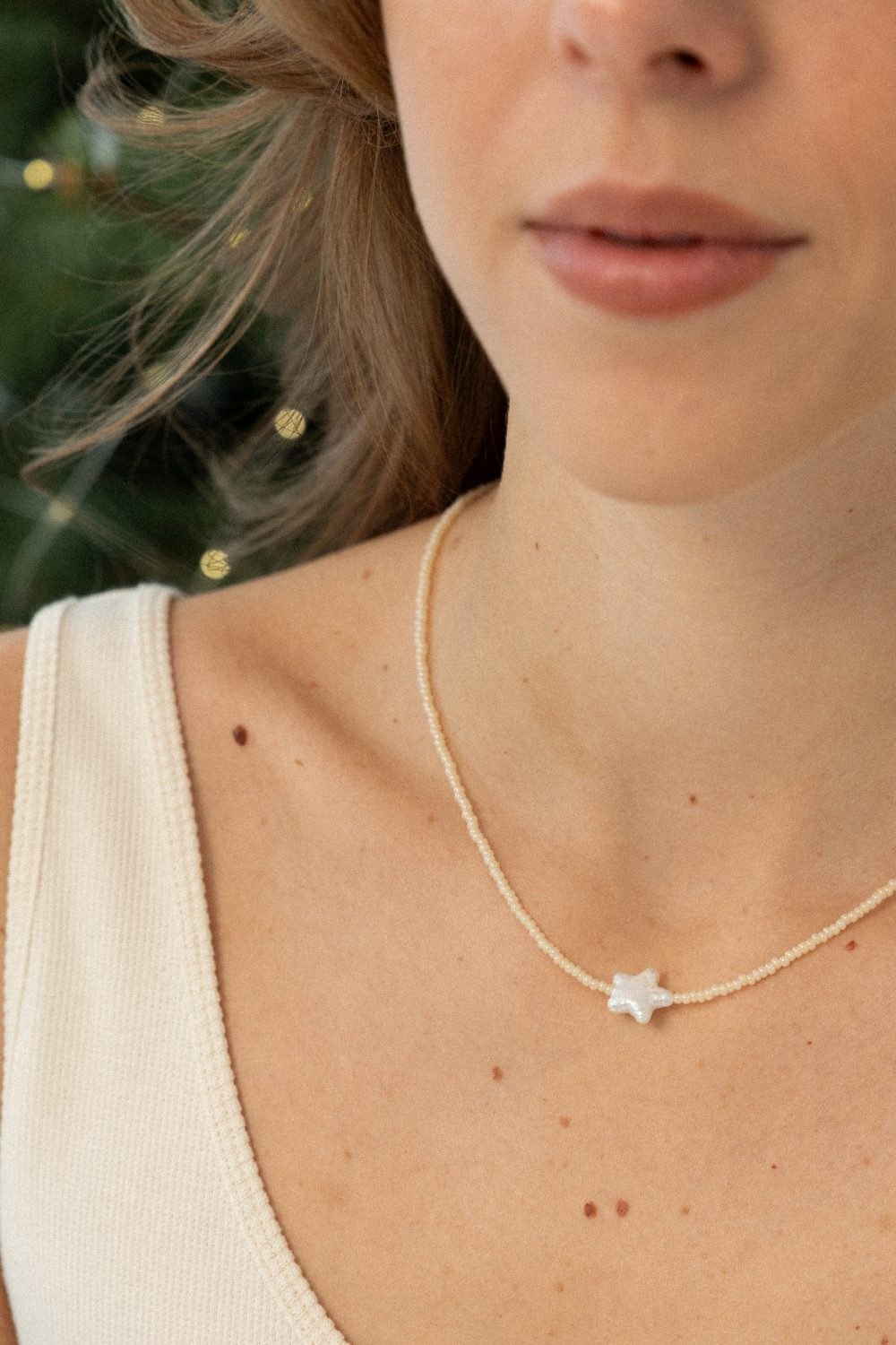 Naszyjnik ze szklanych koralików z naturalną perłą w kształcie gwiazdki. Zapięcie wykonane jest ze srebra pozłacanego. Biżuteria wykonywana jest przez nas ręcznie. Każdy model jest unikatowy i może nieznacznie różnić się od prezentowanego na zdjęciu.